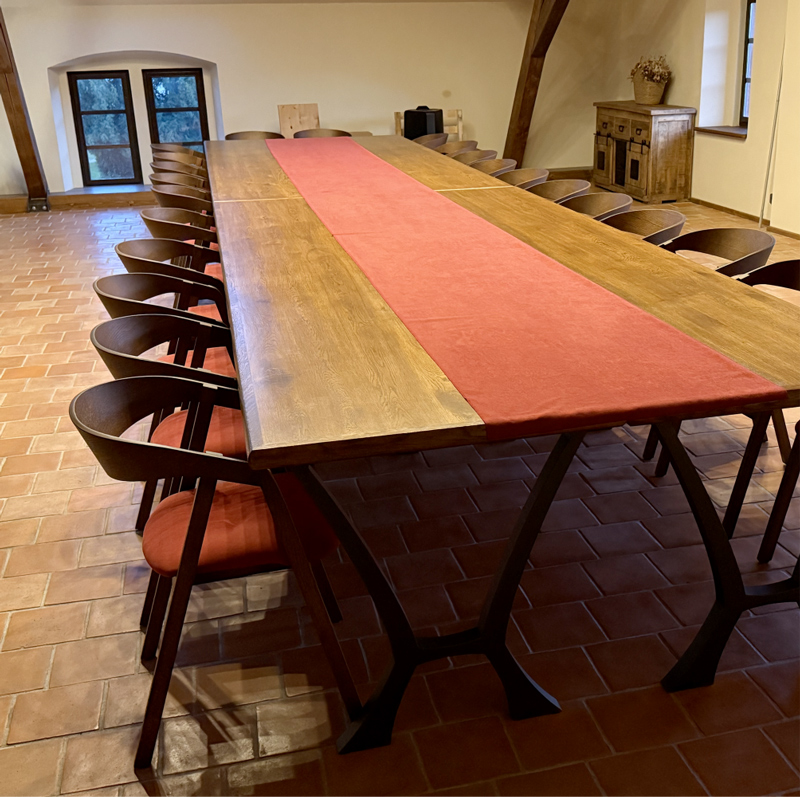 Vznikly tak originální jednací stoly, kompletní vybavení kanceláří, zavěšené industriální police i kovové plastiky.